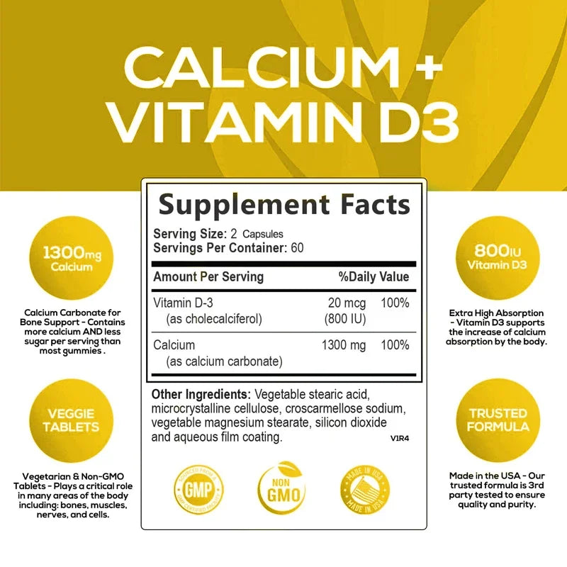 Active Ingredients: Contains 1300 mg Calcium Carbonate and 800 IU Vitamin D3